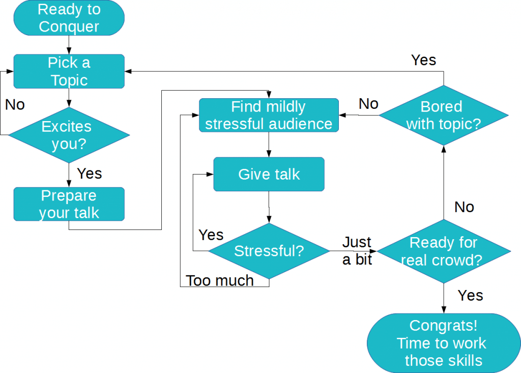 For those of you who are visual or technical, the following text is explained in the diagram below. Our first task is to find a starting point. If just the thought of presenting to people gets you sweating or causes heart palpitations, maybe just present to an empty room. The best is a room that feels familiar. You might feel embarrassed presenting to an empty room, but it will help you establish a feeling of control (sometimes called ‘owning the room’).